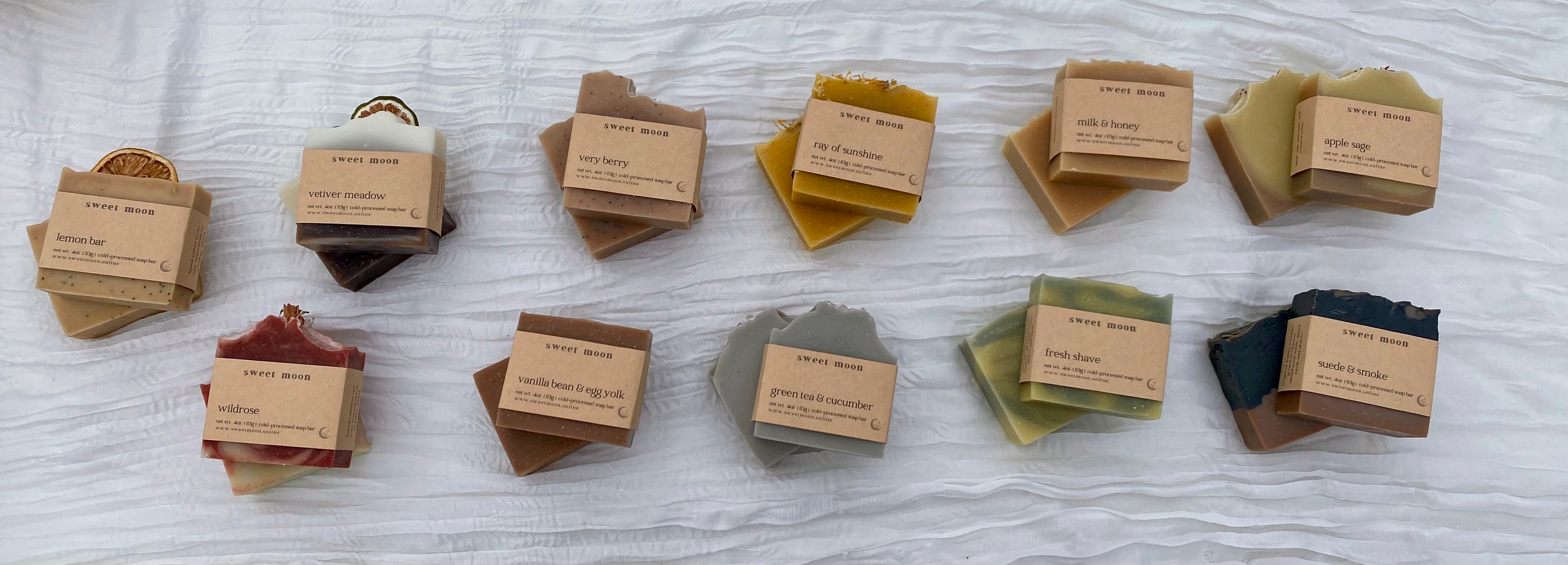 Each soap at Sweet Moon is made with care in small batches, using saponified plant and natural oils for a creamy, nourishing lather. Inspired by the simple joys of homestead living, our bars are scented with gentle, thoughtfully chosen fragrances, naturally colored with clays, botanicals, or garden-fresh juices, and often topped with rustic touches like petals, seeds, or wedges. Every bar carries a bit of warmth, comfort, and the handcrafted charm of home into your daily routine.